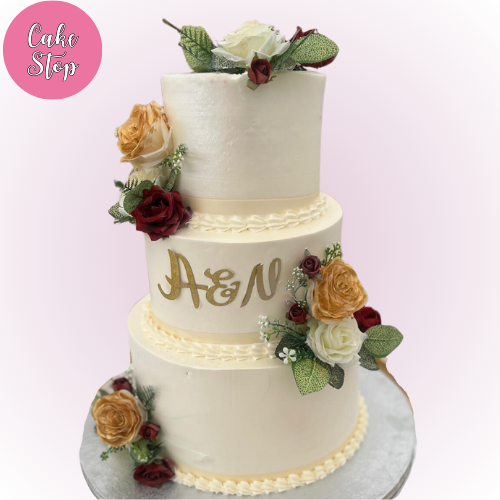 This charming three-tier wedding cake combines a touch of personalisation with floral sophistication. Featuring a custom monogram in gold, soft ivory tiers, and a mix of handcrafted burgundy, gold, and white roses, this cake perfectly blends romance and individuality. The delicate piped detailing adds a subtle vintage charm, making it an ideal choice.