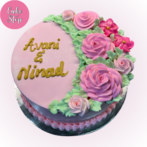 A beautifully soft cake decorated with delicate pink and purple buttercream roses, along with other floral accents in pastel shades. Personalised with names and finished with a light shimmer, this cake is perfect for any romantic or special occasion.