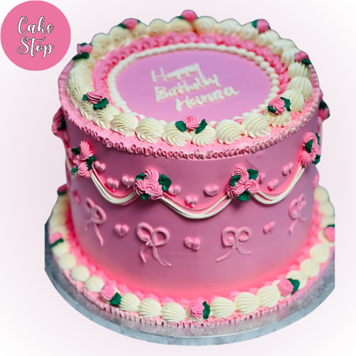 A charming extra-height cake with soft pink icing, adorned with delicate whipped cream swirls, pink bows, and roses. The cake features a personalised birthday message and is perfect for a sweet, elegant celebration.