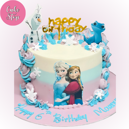 A beautiful Frozen-themed cake featuring Elsa and Anna, surrounded by pastel blue and pink buttercream swirls. Topped with Olaf and a personalised birthday message, this cake is perfect for a little Frozen fan’s magical birthday celebration.