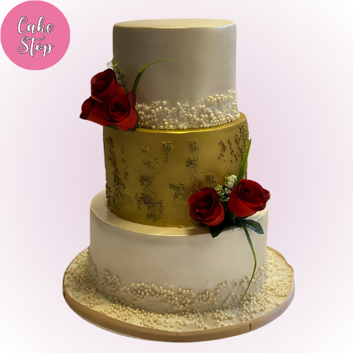 This luxurious three-tier wedding cake blends modern elegance with timeless charm. The centrepiece is a stunning gold middle tier adorned with intricate patterns, flanked by ivory tiers encrusted with delicate sugar pearls. Bold red roses add a dramatic pop of colour, making this cake a statement piece for any sophisticated wedding celebration.