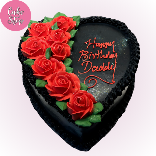 A beautifully decorated heart-shaped cake featuring rich black icing, adorned with vibrant red buttercream roses and delicate green leaves. The cake is personalised with a birthday message, making it a perfect choice for a romantic and thoughtful celebration.