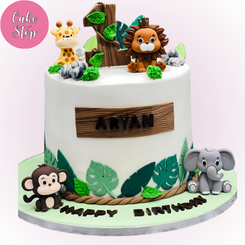 A fun and vibrant jungle-themed cake featuring adorable animal figurines like a giraffe, lion, monkey, elephant, and tiger. The cake is personalised with the name and a “Happy Birthday” message, making it a perfect choice for a young adventurer’s birthday celebration.
