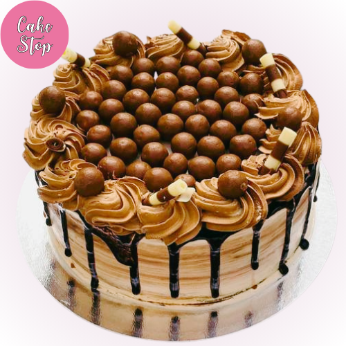 A delicious chocolate cake topped with creamy chocolate buttercream and generously adorned with Maltesers and chocolate wafer sticks. Finished with a rich chocolate ganache drip, this indulgent cake is a perfect choice for any chocolate lover looking for a decadent treat.