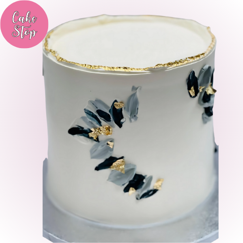 A minimalist yet sophisticated cake with a smooth white finish, featuring delicate marble-like designs in grey and black, and accented with gold leaf for a luxurious touch. Perfect for a refined and elegant celebration.