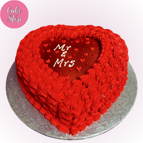 A beautiful heart-shaped cake in rich red buttercream, decorated with intricate rose swirls and personalised with “Mr & Mrs” and heart-shaped accents. This cake is perfect for weddings, anniversaries, or any romantic celebration.