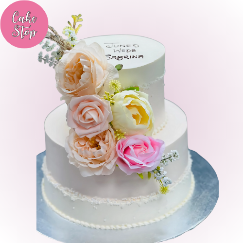 This elegant two-tier wedding cake features soft pastel roses in blush, peach, and pink tones, beautifully arranged to cascade down the side. The minimalist ivory base is accented with delicate piped details and personalised text on the top tier, adding a unique touch. Perfect for a romantic and intimate wedding celebration.