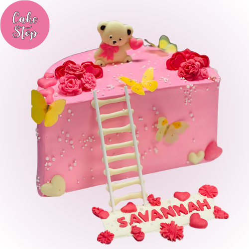A whimsical cake featuring a cute teddy bear, colourful butterflies, and vibrant flowers. The playful design includes a sweet ladder and a personalised name, making it a perfect choice for a joyful birthday celebration.