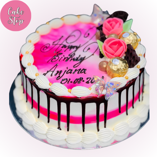 A vibrant cake featuring a smooth pink gradient finish, topped with a glossy chocolate ganache drip. Adorned with beautiful pink roses, delicate chocolate shards, and golden edible spheres, this cake is perfect for celebrating any special occasion with elegance and sweetness.
