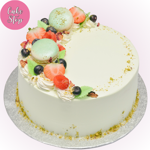 A rich pistachio-flavoured cake adorned with fresh berries, macarons, and delicate whipped cream swirls. Finished with crushed pistachios for an added crunch, this cake offers a perfect blend of nutty and fruity flavours, making it an elegant choice for any special occasion.