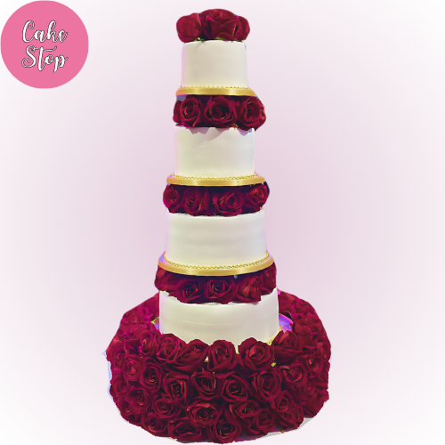 This grand four-tier wedding cake is a true showstopper. Each tier is wrapped with deep crimson roses, complemented by golden accents that exude royalty and sophistication. The base, adorned with a lush bed of roses, creates a strikingly bold and luxurious statement, perfect for large-scale celebrations that demand attention and elegance.
