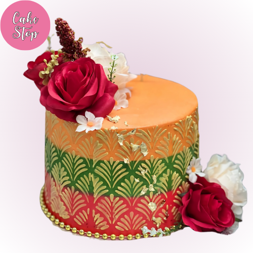 A stunning cake featuring a bold, vibrant gradient of orange and green, decorated with beautiful red roses and delicate white flowers. The cake is finished with gold accents and a bead border, creating a regal and festive look perfect for special occasions.
