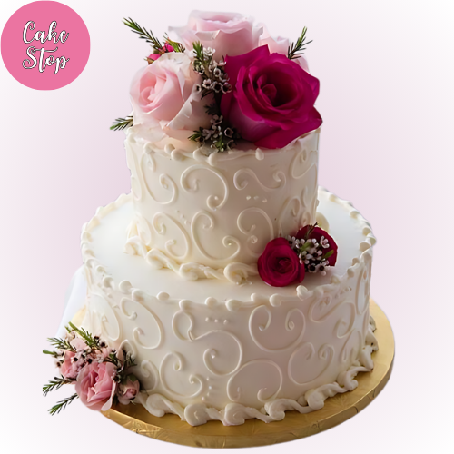 This charming two-tier wedding cake features a whimsical swirl design piped across the ivory base, complemented by vibrant pink and blush roses. Sprigs of greenery and delicate floral accents enhance the romantic garden-inspired aesthetic, making it a delightful choice for intimate and light-hearted celebrations.