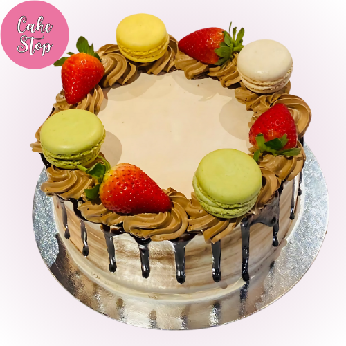A beautifully decorated chocolate cake topped with fresh strawberries and delicate chocolate garnishes. The cake is adorned with whipped cream swirls and a smooth chocolate drizzle, making it the perfect balance of elegance and flavour for any special occasion.