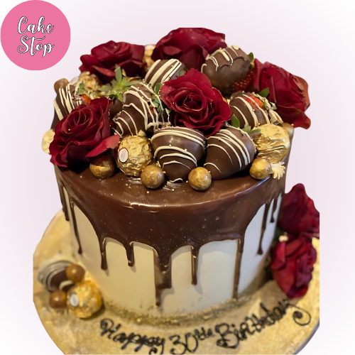 A luxurious chocolate cake adorned with deep red roses, Ferrero Rocher chocolates, choco strawberries, and drizzled with rich chocolate ganache. The cake is finished with a personalised birthday message, making it a stunning choice for a romantic or sophisticated celebration.