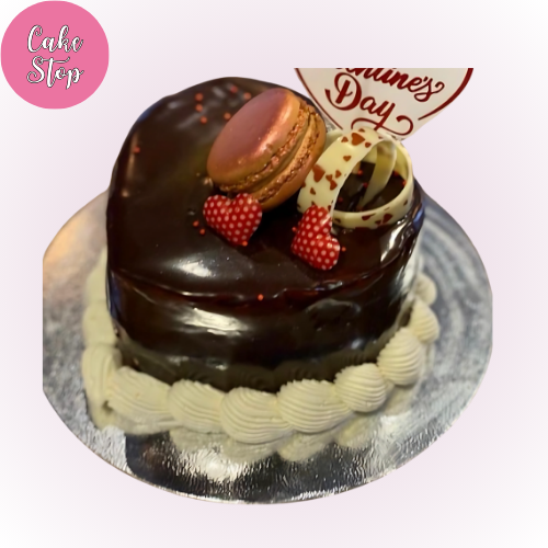 A decadent heart-shaped cake covered in smooth chocolate ganache, decorated with a macaroon, white chocolate curls, and a romantic “Valentine’s Day” topper. Finished with whipped cream swirls and heart-shaped accents, this cake is a perfect treat for a special someone on Valentine’s Day.